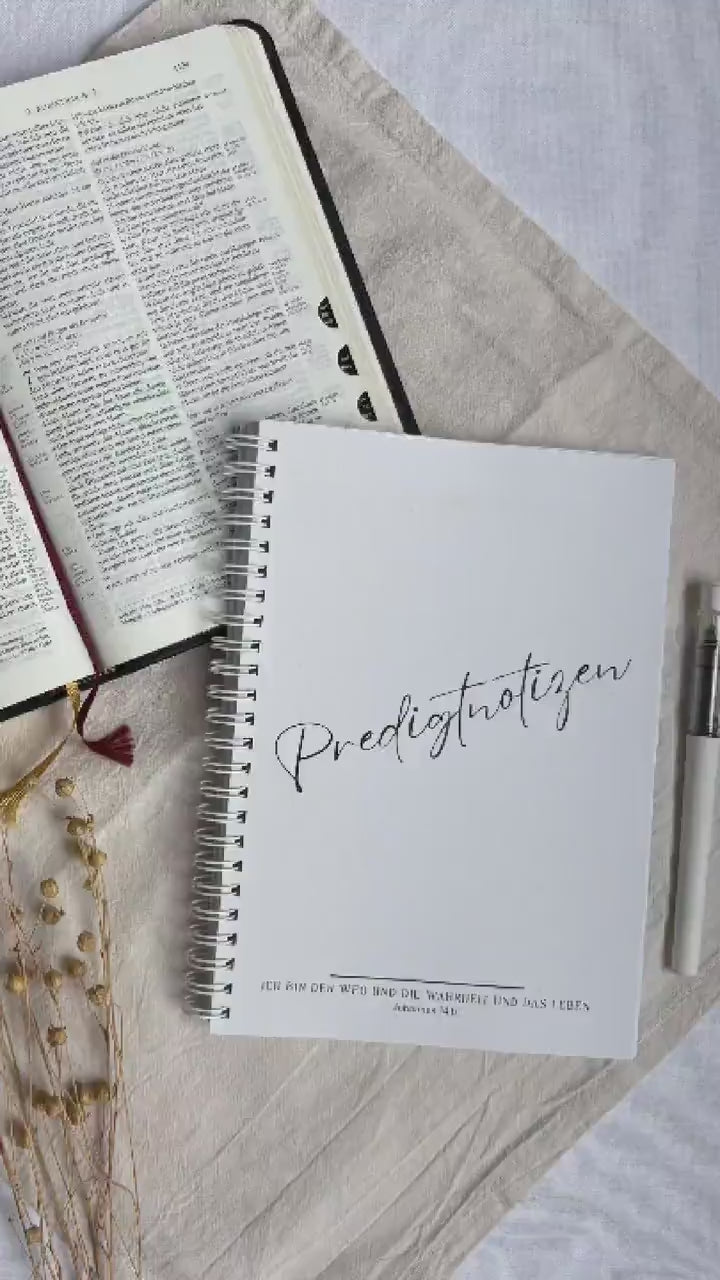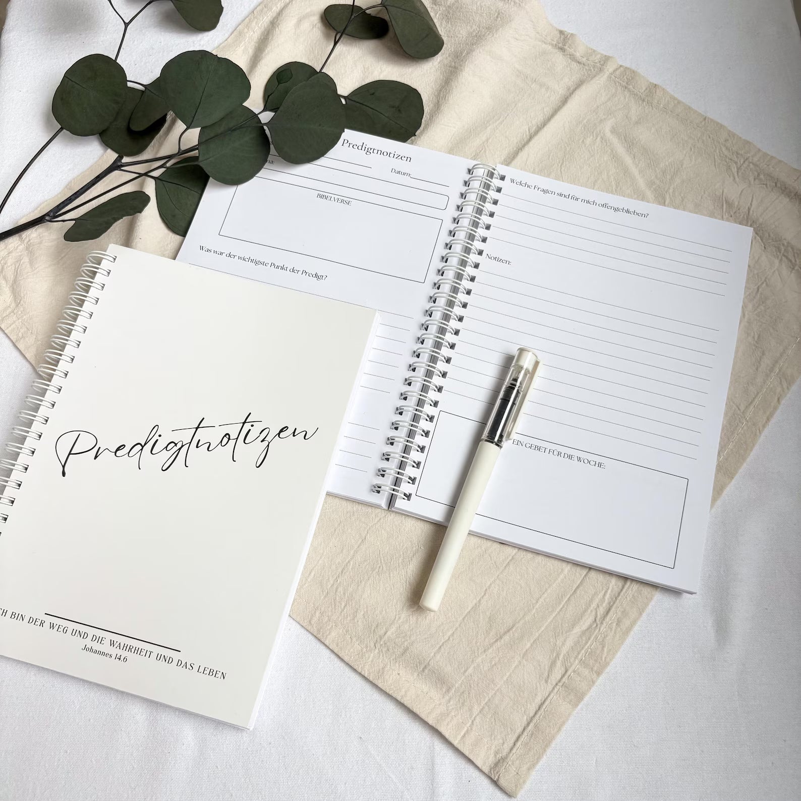 Kennt ihr das? Die Predigt war so gut, aber kaum ist der Gottesdienst vorbei, habt ihr schon die Hälfte vergessen. Genau dafür habe ich dieses Predigtnotizbuch gemacht – zum Festhalten, Nachdenken und Erinnern.“